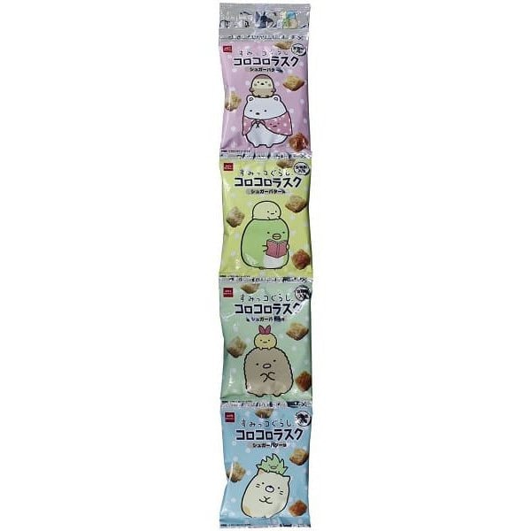 특징 : 대인기 캐릭터 「스미코구라시」라고 콜라보레이션한, 한쪽 크기의 러스크. 전체 알갱이가 들어간 빵을 한 사이즈로 자르고 알맞은 단맛의 설탕 버터 맛으로 완성했습니다. 그대로는 물론 우유와 요구르트를 걸거나 다양한 어레인지도 즐길 수 있습니다.