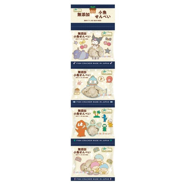 시즈오카 이사이의 정어리로 만든, 국산 이와시의 구운 것, 끓인 말린 분말을 사치스럽게 사용해, 홋카이도산 감자 전분을 베이스로 해, 센베이를 만들었습니다: 분리할 수 있는 4연 타입으로, “2023년 산리오 캐릭터 대상 '제1위 시나모롤을 비롯해 크로미, 포차코, 마이멜로디, 헬로키티 등 인기 캐릭터를 패키지로 채용하고 있다. 또, 패티&지미나 골로 피카돈 등 그리운 캐릭터도 등장해, 뒷면에는 캐릭터에 얽힌 퀴즈도 있습니다.