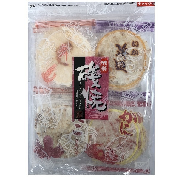 특징: ●소의 풍미 가득. 새우 · 오징어 · 타코 · 게, 4 종류의 센베이의 포장입니다. ● 한 장마다 개별 포장으로 각 3 장들이. ●척이 있는 봉투 타입입니다.