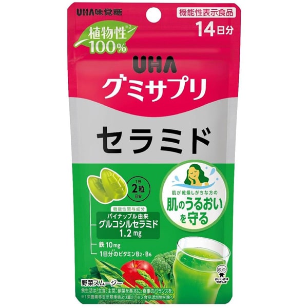 【특징】: ・언제 어디서나 맛있게 영양 섭취할 수 있는 구미 제형의 보충제입니다.・식물성의 원재료만으로 만들고 있어, 자연 식품에 가까운 형태로 섭취해 주실 수 있으므로, 비건이나 내츄럴 지향의 분에게도 섭취해 주시기 쉬운 상품으로 완성되고 있습니다.・파인애플 유래 글루코실세라미드 2알에 1.2mg 배합하고 있습니다. 또, 철 10mg과 1일분의 비타민 B2·B6도 배합하고 있습니다.・야채 스무디 맛으로 맛있게 드실 수 있습니다.