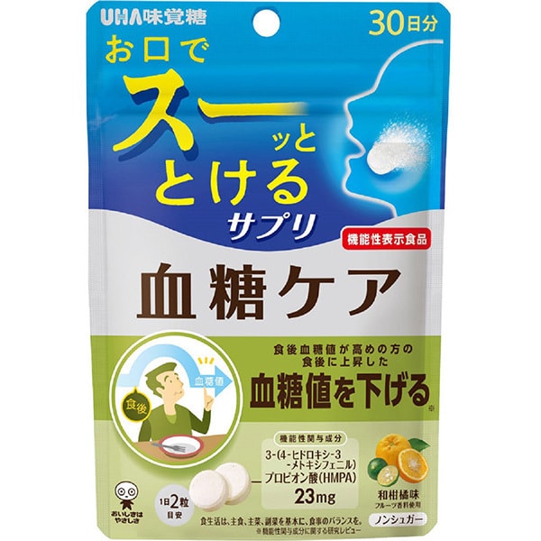 특징 : 보충제는 귀찮고 약처럼 싫어한다고 느끼는 분 없습니까? UHA 보충 시리즈는 그런 당신에게 "매일 맛있게 즐겁게 계속하는 보충제"를 제안! ■속용 기술 「순간 붕괴 제법」(특허 출원중) 구강내의 적은 수분(타액)으로 즉 용해되는 신기술 「순간 흡수 제법」을 매일 계속하는 서플리먼트로 실현했습니다. 일반적인 의약품의 속용정에 사용되고 있는 붕괴제는, 많은 수분을 통해 용해하는 것에 대해, 붕괴제를 사용하지 않고 제법만으로 속용감을 만들어 내는 것으로, 타액량이 적은 쪽( 노인이나 드라이 마우스 환자)에도 섭취하실 수 있습니다. 또한 용해 속도도 의약품의 속용정과 비교해도 빠르게 녹을 수 있도록 개량을 거듭하여 압도적 속용감을 실현하고 있습니다. ■식사만으로는 충분히 섭취하기 어려운 3-(4-히드록시-3-메톡시페닐)프로피온산(HMPA)을 23mg 배합해, 식후 혈당치가 높아지는 분의 식후에 상승한 혈당치를 낮춥니다 . ■ 성분 유래의 쓴 맛을 억제하면서, 일본 감귤 맛으로 맛있게 섭취하실 수 있도록하고 있습니다.