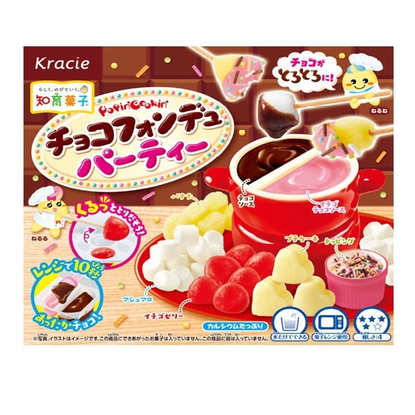 특징 : ● 초콜릿 소스와 딸기 초콜릿 소스의 2 종류를 만들 수 ● 재료는 딸기 젤리, 바나나, 쁘띠 케이크, 마시맬로의 4 종류 ● 좋아하는 재료를 2 종류의 초콜릿 소스에 붙여 즐길 수있다.