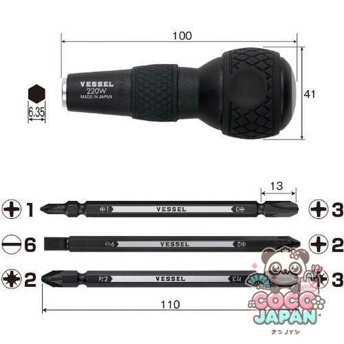전기 스크루 드라이버 비트 (6.35mm 반대쪽)를 삽입하여 핸드 드라이버로 사용할 수있는 "볼 그립 비트 교체 그립"을 포함하여 세 가지 유형의 이중 헤드 비트 세트입니다. 그립은 친숙한 볼 그립입니다 [[+]] 1 및 [[+]] 3, [[-]] 빠른 연결 터미널 및 [[+]] 2에 사용할 수있는 블레이드 팁 및 수입 가구 및 스노 보드 바인딩을 조립하는 데 종종 사용되는 Poji Drive PZ2 및 PZ3가 하나의 팩에 포함됩니다.