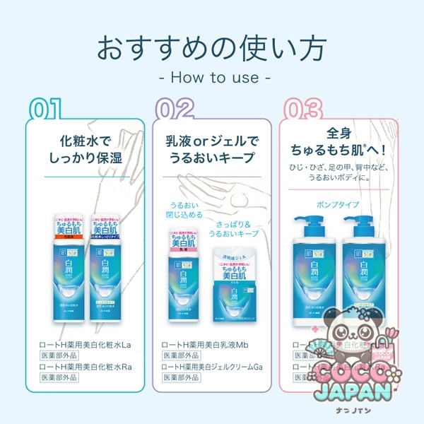 "하다라보 白潤薬用美白ジェル」は、うるおいと白さにこだわるさっぱり薬用美白ジェルです。美白有効成分ホワイトトラネキサム酸※、肌荒れ防止有効成分アラントイン配合。ニキビ予防しながらうるおって、キメ細かいちゅるもち肌へ。弱酸性。無香料・無着色。鉱物油・アルコール(エタノール)・パラベンフリー。