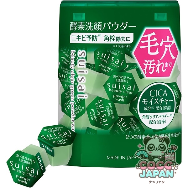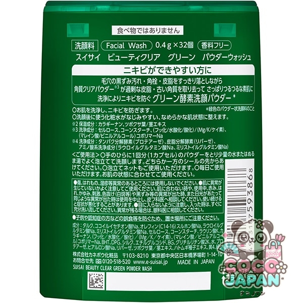여드름이 생기기 쉬운 분에게. 모공의 검게 얼룩·각전을 깔끔하게 떨어뜨리면서, 각질 클리어 파우더※1이 과잉인 피지·오래된 각질을 제거. 깔끔한 매끄러운 맨살로 이끄는 그린 효소 세안 파우더 ※2. ※1 세정 성분:셀룰로오스, 옥수수 전분, (불화/수산화/산화)/(Mg/K/규소), (말레산/비닐알코올) 공중합체 Na ※2 녹색의 파우더상 세안료