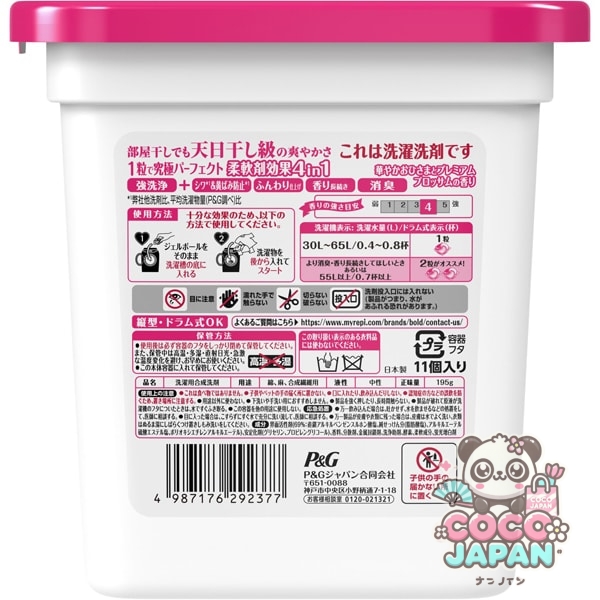 그 외 ●내용량:11개 ●향기:화려한 오이사마와 프리미엄 블로섬의 향기 ●외장 사이즈(중량):높이 128 mm×폭 127 mm×깊이 94 mm(244 g) 산염), 알킬에테르황산에스테르염, 폴리옥시에틸렌알킬에테르), 안정화제(글리세린, 프로필렌글리콜), 향료, 분산제, 금속봉쇄제, 세척조제, 효소, 유연성분, 형광증백제 기타 P&G의 헬스 & 뷰티를 찾는 볼드>일용품 볼드>세제 볼드>세탁·마무리제 볼드>젤 볼형 세제 ​​볼드