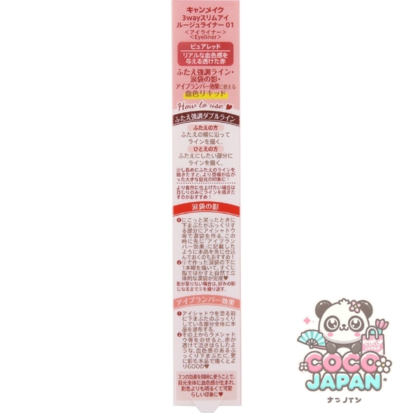 리얼한 혈색감이 나오는 절묘 투명 레드. 투명 레드가 눈앞에 혈색감을 준다. 후타에 강조・눈물 주머니의 그림자・아이 플랜퍼 효과(※메이크업 효과)에 사용할 수 있는 격세필의 혈색 라이너. 엄선한 격세필은 선이 굵어지지 않고 그릴 수 있다. 물, 땀, 피지, 문지름에 강하다. 미용액 성분 배합.