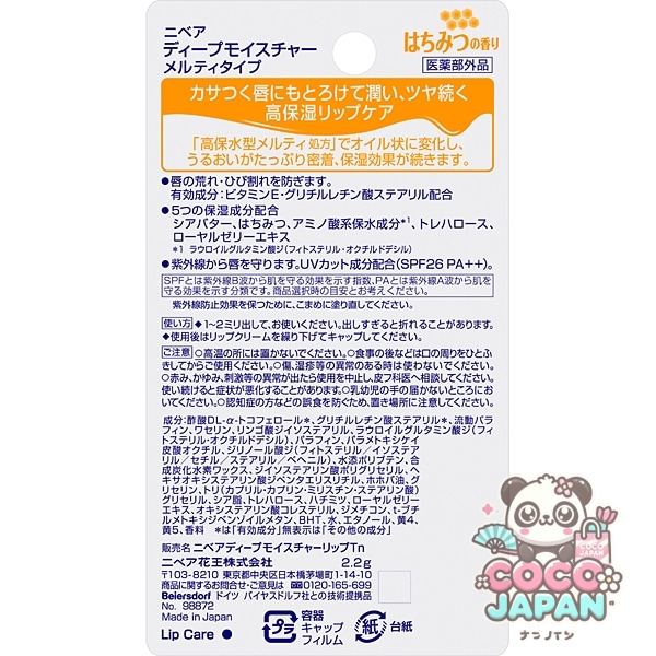 카사 붙는 입술에 녹아 밀착. 고 보습 · 윤기 계속 립 크림. 「고보수형 멜티 처방」으로, 바른 순간 크림이 오일 형태로 변화해, 촉촉함이 충분히 밀착. 보습 효과가 계속됩니다. 입술의 거칠기, 균열을 방지합니다. 유효성분(비타민 E·글리틸레틴산스테아릴) 배합. 자외선으로부터 입술을 보호합니다. UV컷 성분 배합(SPF26/PA++). 【의약부외품】