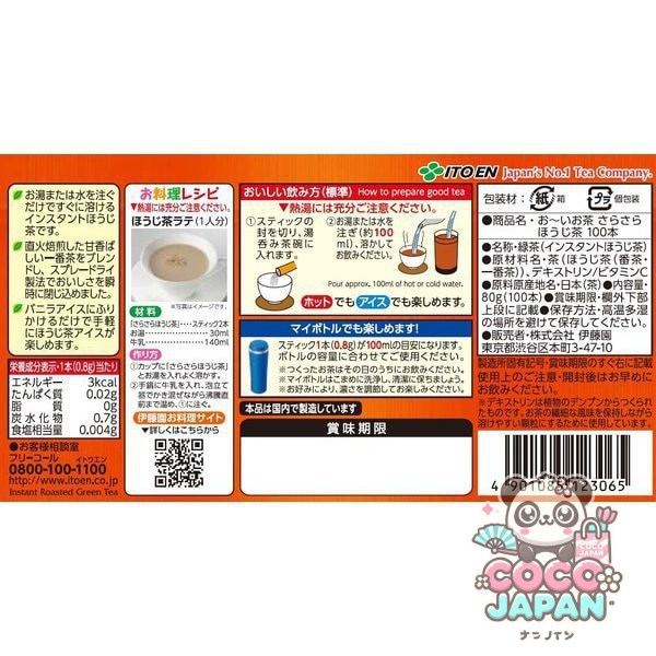 그 외 ●스틱 타입 0.8g×100개 ●원재료:차(호지차(반차, 제일차)), 덱스트린/비타민C ●영양 성분(표시 단위:1잔(0.8g)당) 에너지: 3kcal, 단백질: 0.02g, 지질: 0g, 탄수화물: 0.7g, 식염 상당량: 0.004g 이토엔 오이 차> 음료 (음료) 이토엔 오이 차> 커피 콩 · 차잎 · 분말 음료