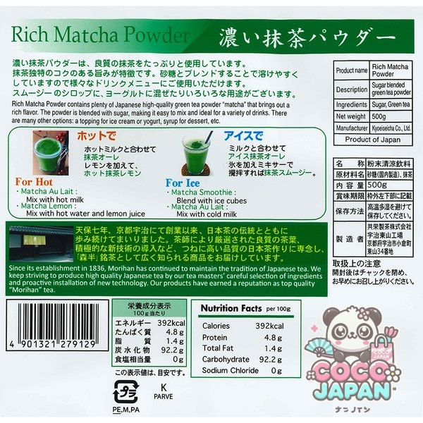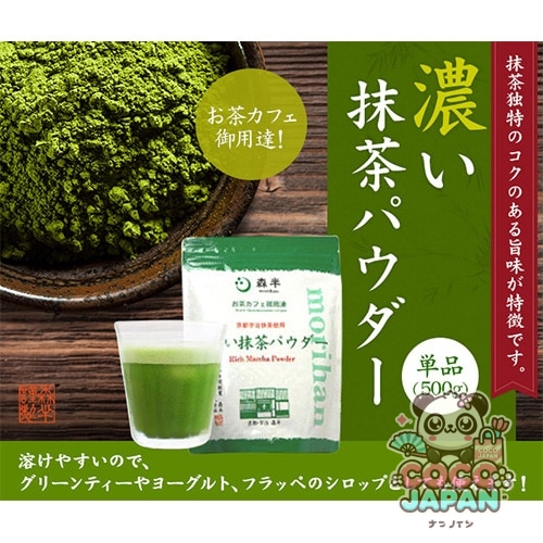 설탕과 말차만으로 만든 녹차입니다. 말차를 많이 사용하고 있으며, 물이나 우유와 섞어 카페 메뉴와 같은 어레인지 음료를 즐길 수 있습니다.